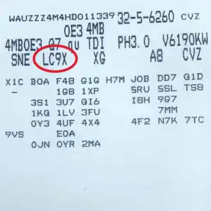 Lakk koden til Audi finner du på innsiden av serviceheftet, en stor hvit etikett. Om du ikke finner den der så sjekk hjulbrønnen bak, bagasjerommet opp på siden i eller under gulv platen i bagasjerommet. På varebiler kan den være på under førersetet. Beskrivelse for lakk koden starter alltid med «L» for «lakk» og er alltid fire siffer/tall. Under vil du se illustrasjon av hvordan lakk koden til Audi ser ut. De mest brukte lakk koder til Audi og VW er LA7W, LB9A, LC9Z, LY3D, LY7T.