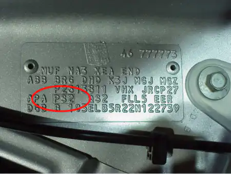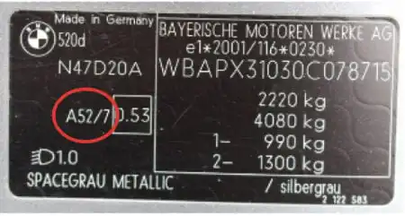 Lakk koden til BMW finner du på dørstolpen, høyre bakdør. Koden er alltid 3 tegn, for eksempel A52. Navnet på lakkfargen står nederst i venstre hjørne på tysk, for eksempel Spacegrau Metallic. Under ser du en illustrasjon av hvordan lakk koden til BMW ser ut.