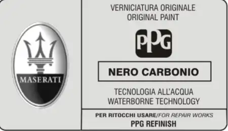 Lakk koden til Maserati finner du i motorrommet. Under vil du se bilde av hvordan lakk koden til Maserati ser ut, lakk farge Nero Carbonio.