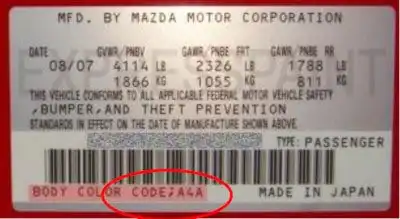 Lakk koden til Mazda finner du nesten ikke på bilen. I noen biler finnes lakk koden på en chassis plate i motorrom dekselet eller i dørstolpen på førersiden. Under vil du se bilde av hvordan lakk koden til Mazda ser ut.