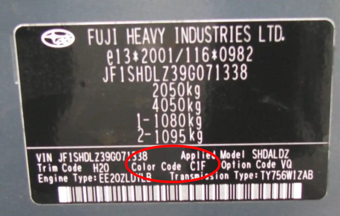 Lakk koden til Subaru finner du på en sort chassis plate i dør åpningen, stort sett på fører døren. I eldre modeller kan du finne en metallplate i motorrommet, fjærbeintårnet eller torpeveggen. Det vil stå color code. Under ser du hvordan koden ser ut, her er color code C1F