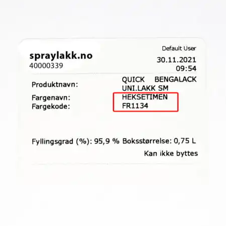 Ønsker du å bruke samme farge, som du har malt med, er det en etikett på malingsspannet med info om hvilket produkt du har kjøp, hvor, klokkeslett, fargenavn, fargekode og farge opprinnelse. Se eksemplet lenger ned på siden.