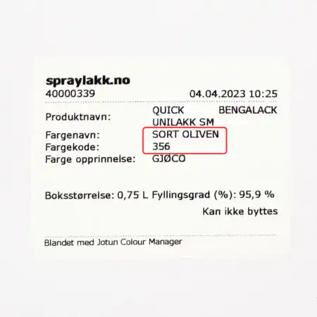 Ønsker du å bruke samme farge, som du har malt med, er det en etikett på malingsspannet med info om hvilket produkt du har kjøp, hvor, klokkeslett, fargenavn, fargekode og farge opprinnelse. Se eksemplet lenger ned på siden.
