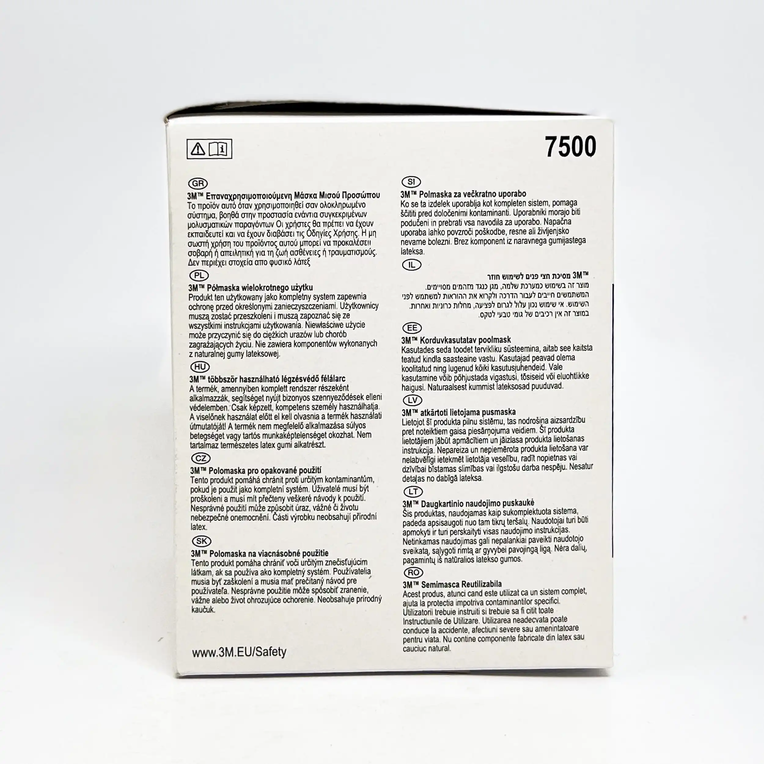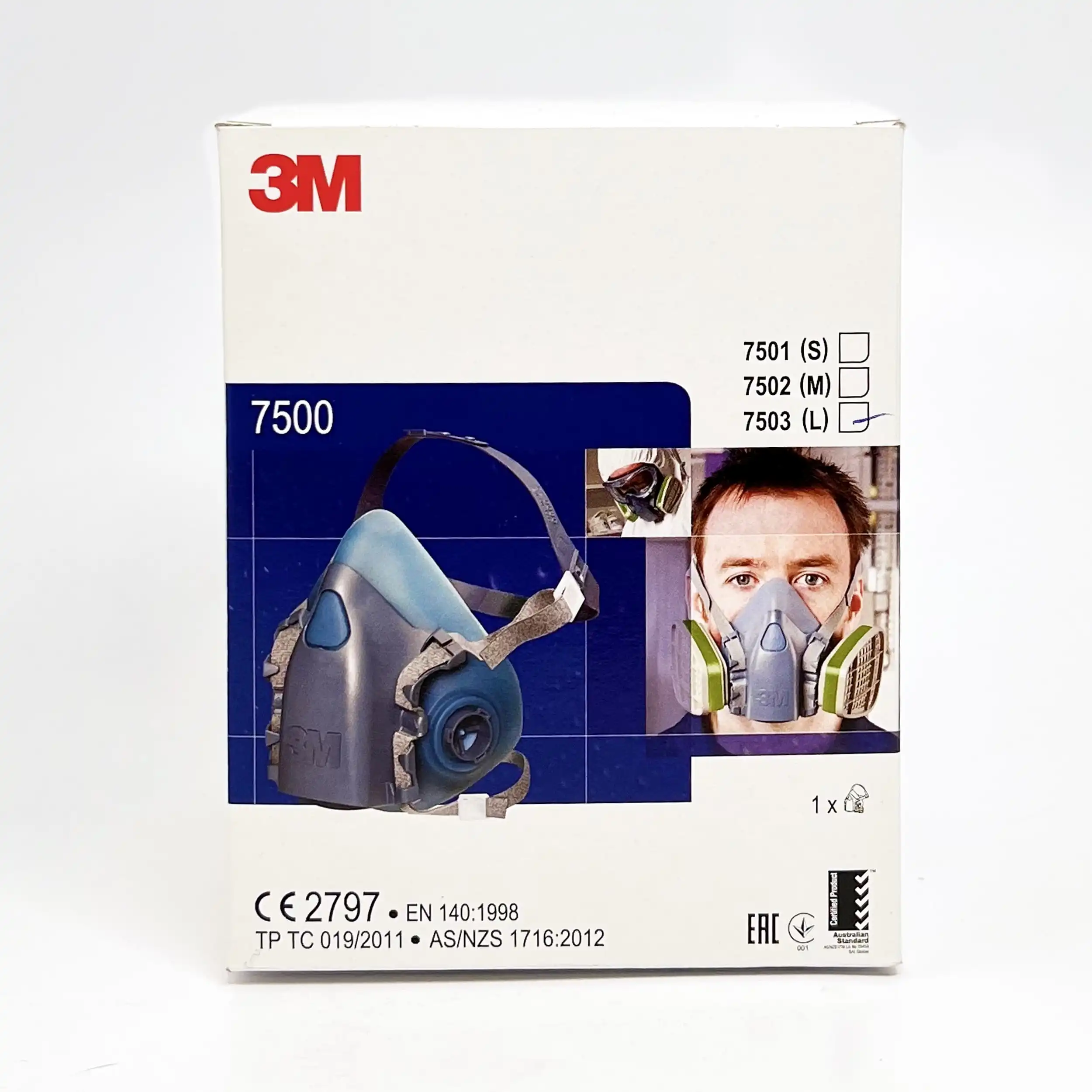 Dette gir en behagelig og fleksibel tetning og reduserer trykket mot ansiktet. 3M 7500 lakkmaske leveres i 3 størrelser: Small, Medium og Large. De tre størrelsene er fargekodet i blå fargenyanser. Maskene har 3MTM bajonettfeste og brukes med utskiftbare doble filtre mot gasser/damper og/eller partikler og de har utskiftbare reservedeler. De kan også brukes sammen med 3MTM S-200 trykkluftsystem eller i dobbeltfunksjon med både filtre og S-200 systemet. Utåndingsventilen, 3M Cool Flow, letter utåndingen og reduserer oppbygningen av fukt, varme og karbondioksid i masken. Hodebøylen er justerbar og maskene har «drop-down» funksjon. 3MTM 7500-serien halvmasker er godkjent i henhold til EN140:1998.
