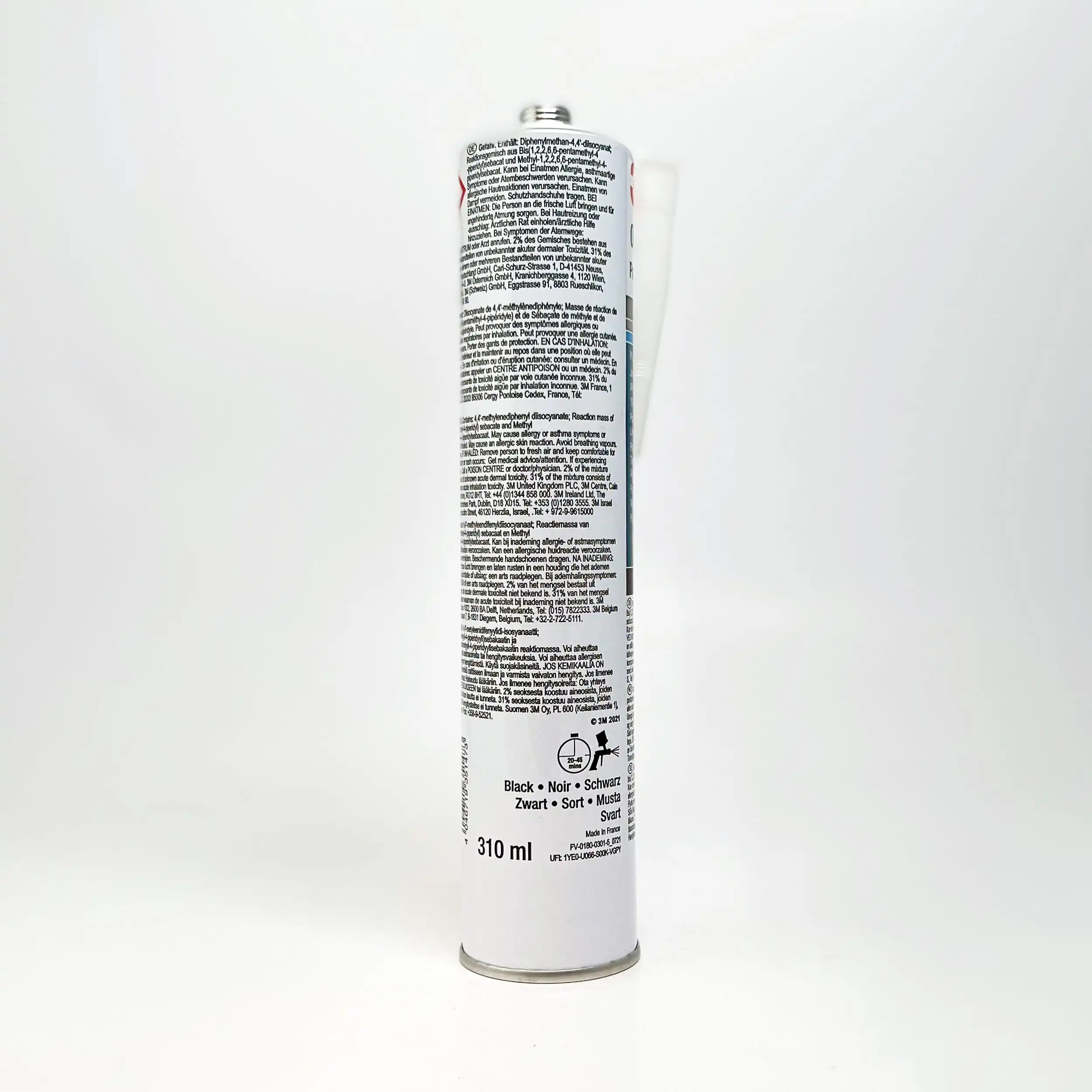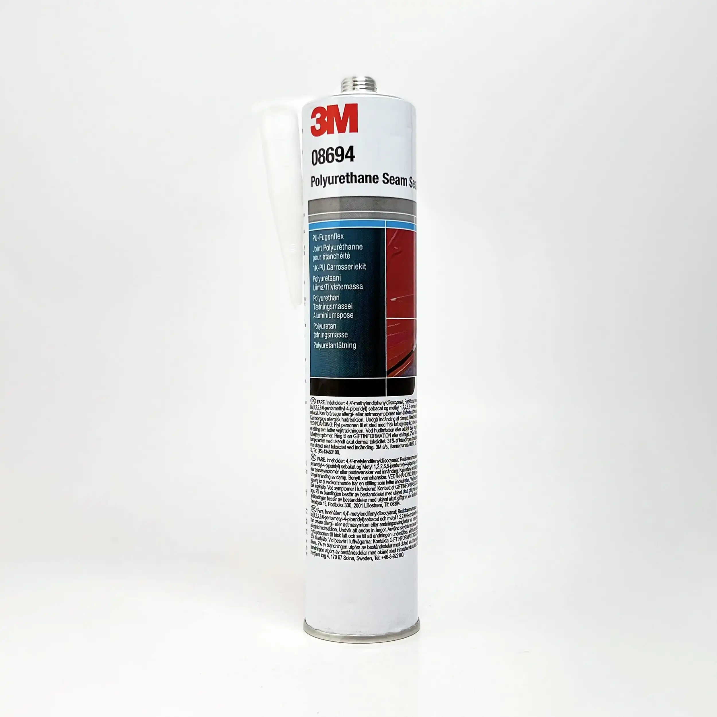 3M 8694 Polyuretan Lim- og Tetningsmasse i patron sort, er 1-K fuktighetsherdende polyuretanprodukter designet for tetningsapplikasjoner i karosserireparasjoner på bil. 3M™ Polyurethane Tetningsstoff er meget solid, klebende 1-K tetningsprodukter, som herdes til et hardt og permanent fleksibelt materiale innen 24 timer, når de utsettes for atmosfærisk fuktighet. (Herdetiden er avhengig av materialtykkelsen og miljøforholdene). Temperaturbestandig fra -40 °C til + 90 °C (midlertidig opp til 120 °C). Ideell for tetting av medium og brede falser, skjøter eller til og med brukes på tre eller plast. Kan brukes direkte på bart stål, og som en gjennomsveisbar tetning. Denne applikasjonen må gjøres mens produktet fortsatt er fuktig (innen 35 minutter etter påføring). Produktet må få herde (minst 45 minutter!) før påføring av vannbasert base.