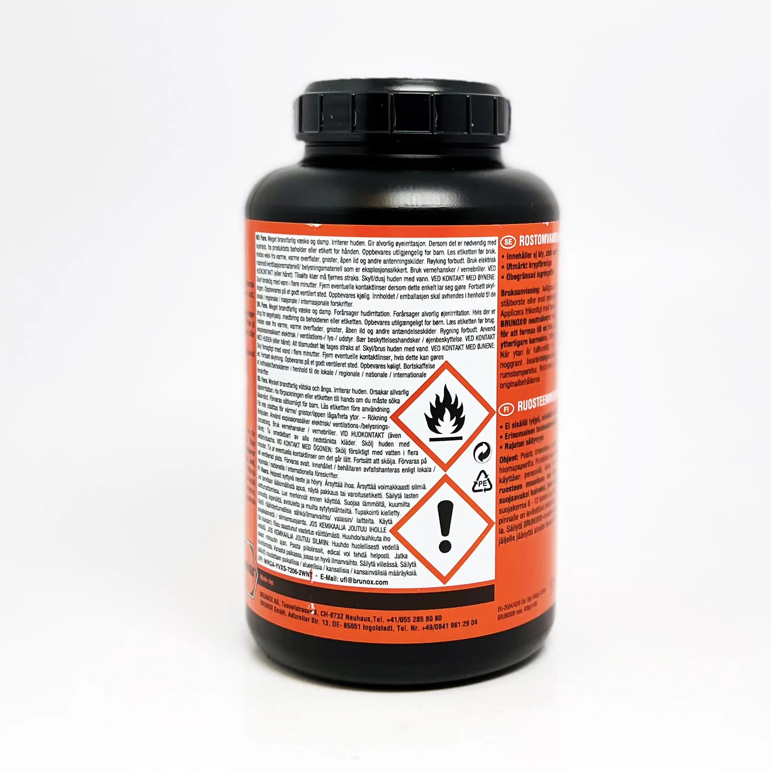 Brunox Rustprimer 1 liter virker slik at rusten blir nøytralisert, og det dannes et metal organisk jern kompleks med jern og rust.