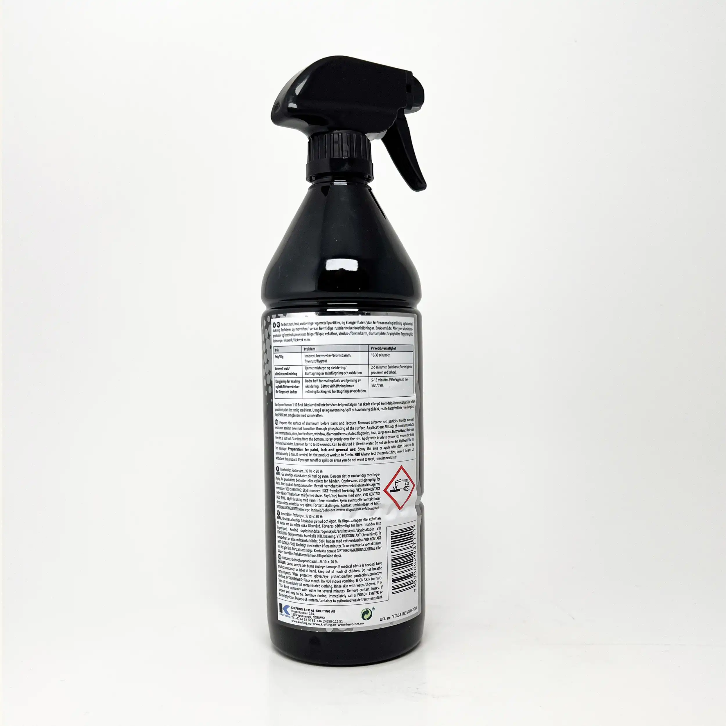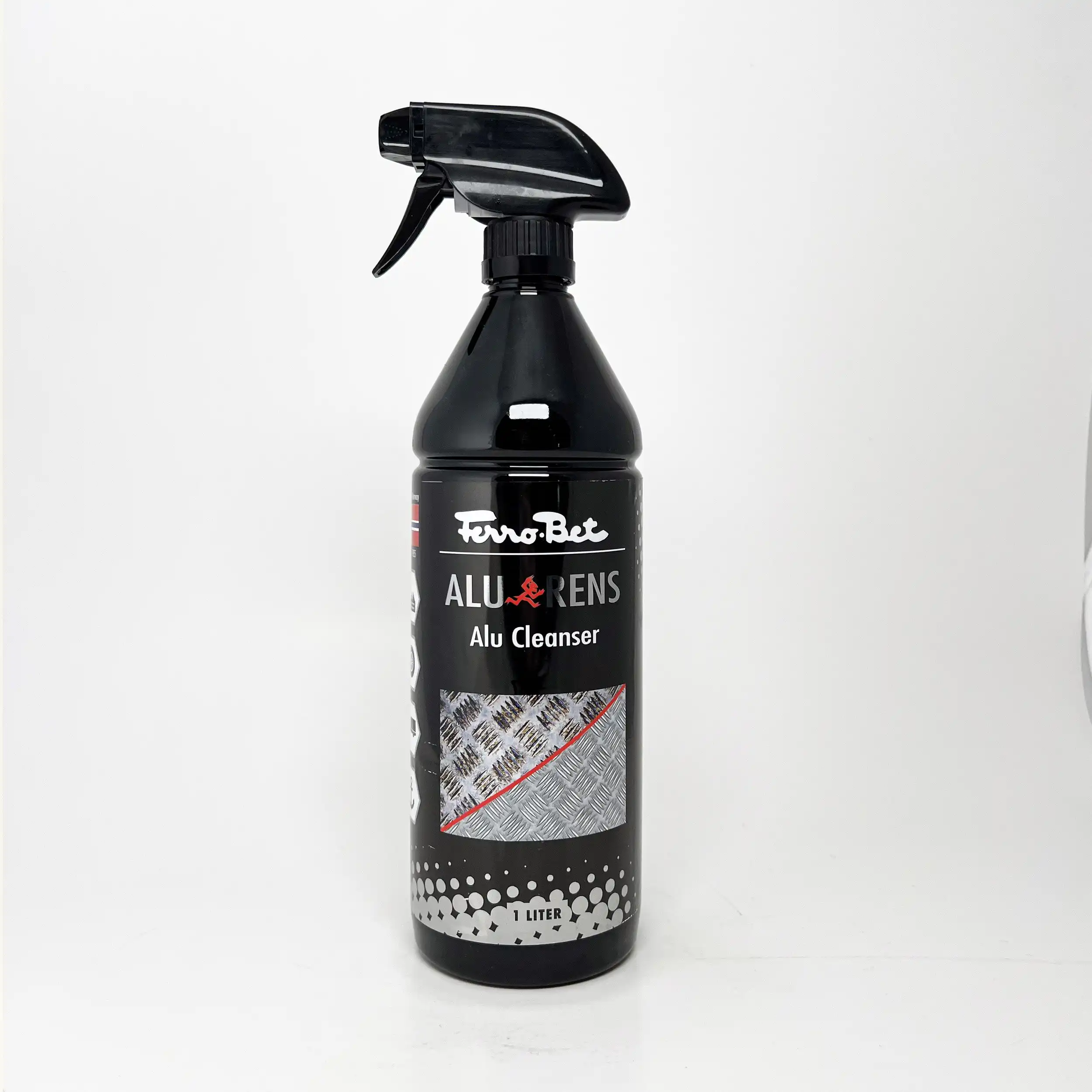 Ferro-Bet Alurens 1ltr fjerner oksidering på aluminium, «svettende» metaller og polert stål. Fjerner urenheter i overflaten på aluminium og gir bedre heft for etterbehandling. Produktet er også en fantastisk felgrens, og fjerner meget effektivt innbrent bremsestøv. Ferro-Bet Alu-Rens er klar til bruk. Kan den tynnes ut med inntil 10 deler vann
