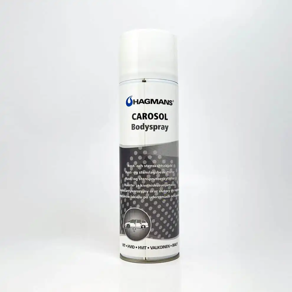 Hagmans Carosol Steinsprutbeskyttelse er akrylbasert rust- og steinsprutbeskyttelse til bilens kanaler, for- og bakskjermer, skjermkanter osv. Tåler vask med avfettingsmiddel, og kan overlakkeres med billakk. Tørketid 15-20 min. Vask og rengjør overflater som skal behandles, gjerne med høytrykksspyler. Vær sparsom med avfettingsmiddel, da dette løser opp eksisterende rustbeskyttelse. Vent til den rengjorte overflaten er helt tørr (ca. 1 døgn). Når det gjelder utvendig på kanaler, skjermkanter og endeplater som skal behandles med Carosol Body er det viktig at man ikke påfører bodyen direkte på bart metall. Denne må først behandles med en rustbeskyttelsesprimer. Hvis lakken er bra, holder det å matte den ned litt med et fint slipepapir.