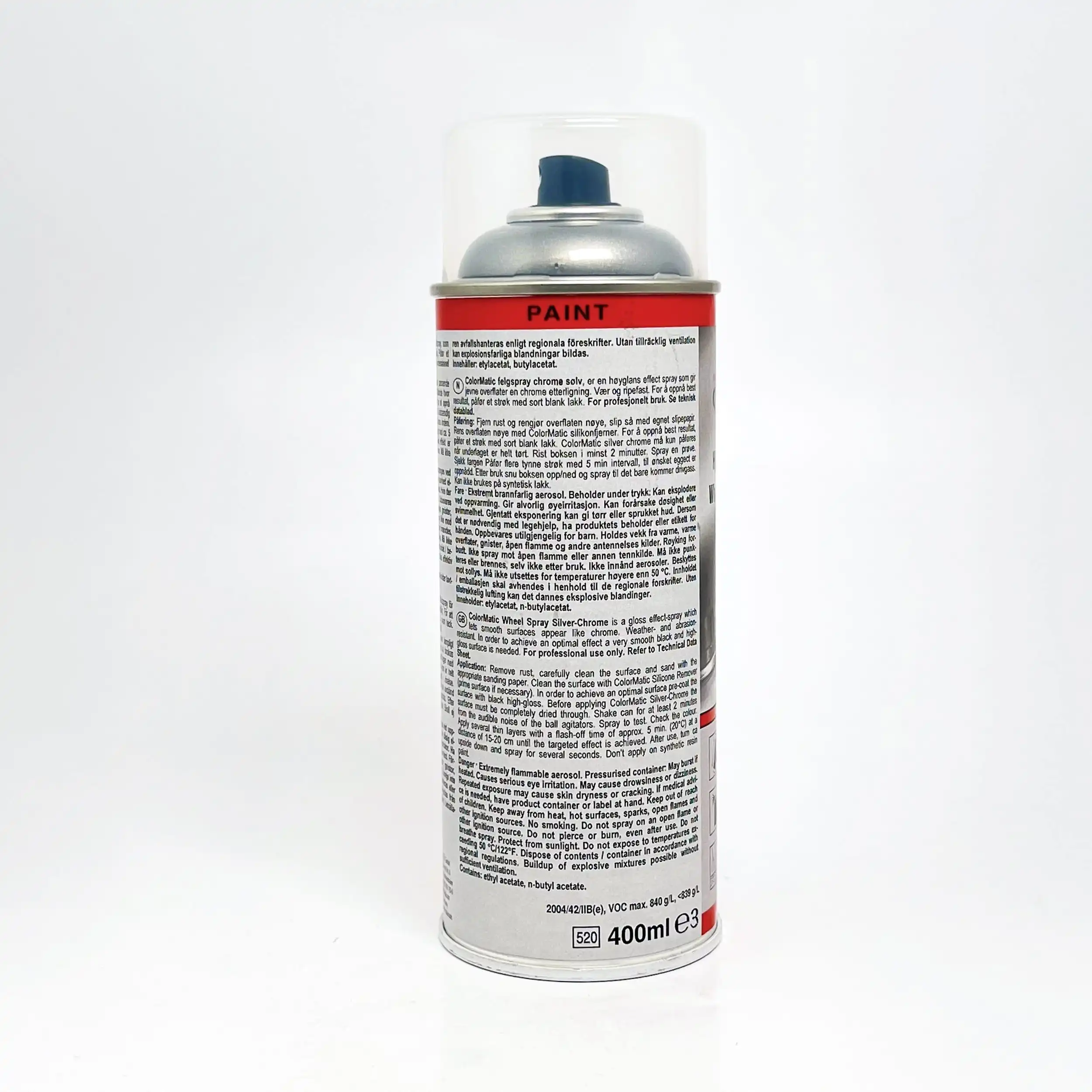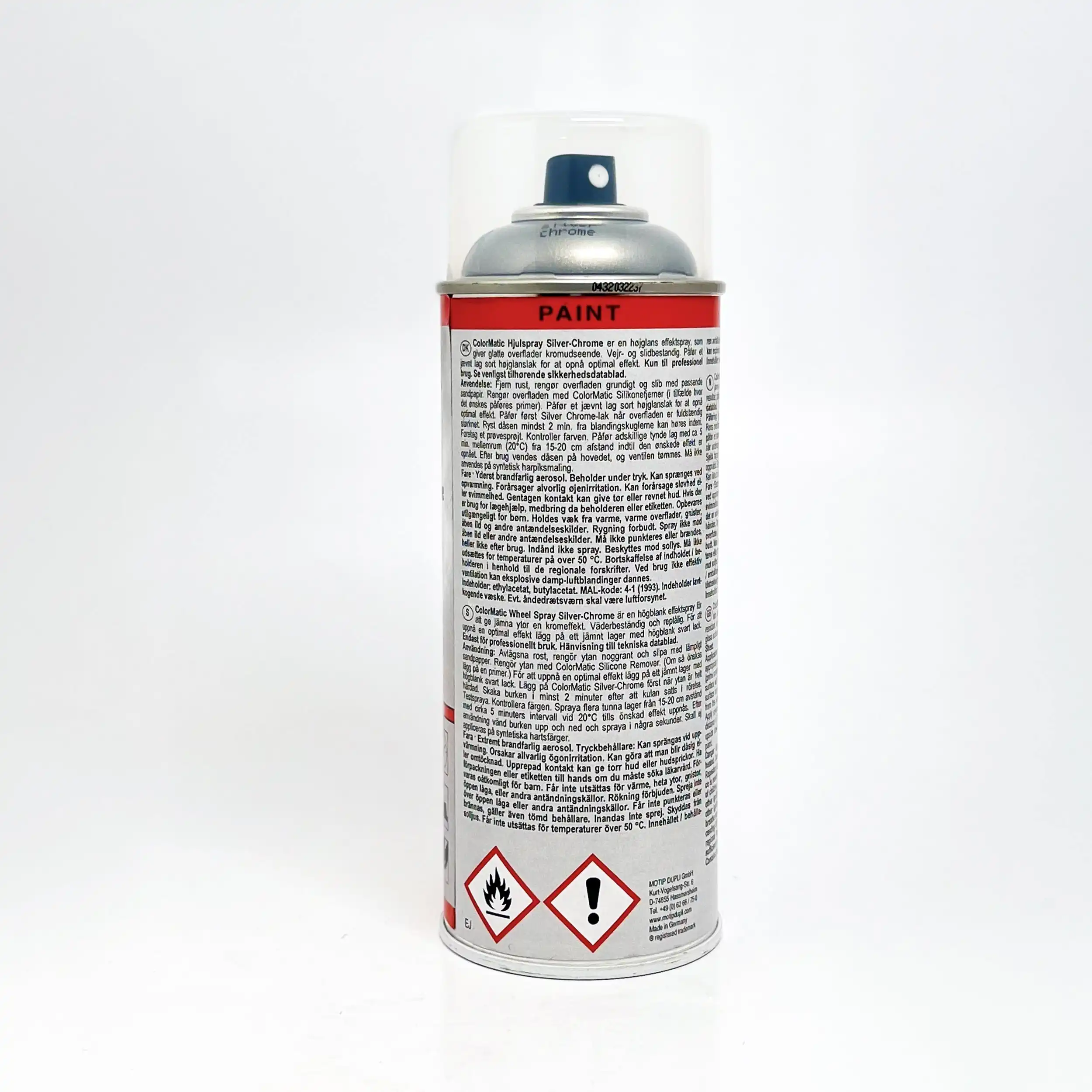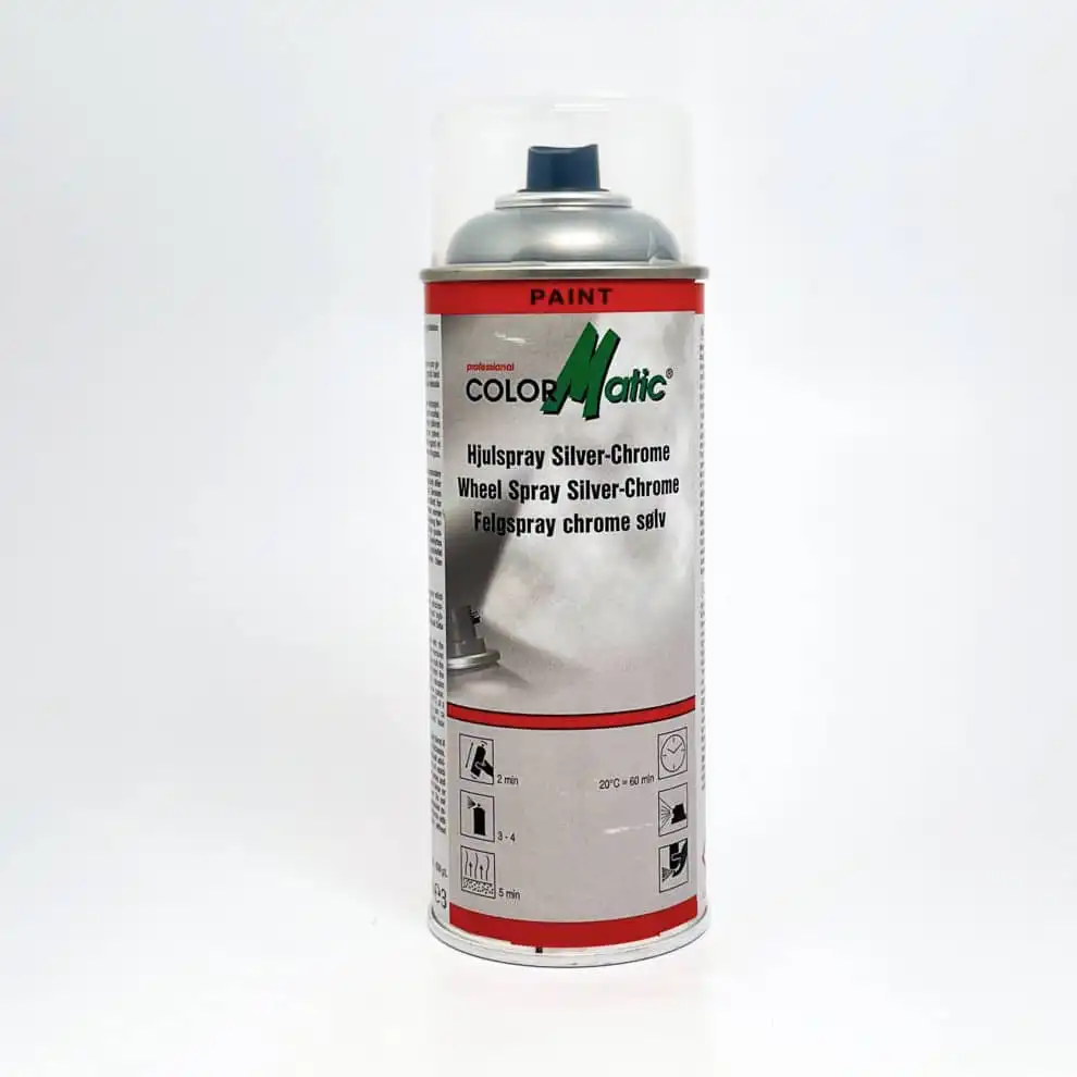 ColorMatic Hjulspray Silver Chrome har en høyglans effekt, som gir deg en jevn overflate som etterligner krom. For å oppnå best resultat, påfør et strøk med sort blank lakk som understrøk.