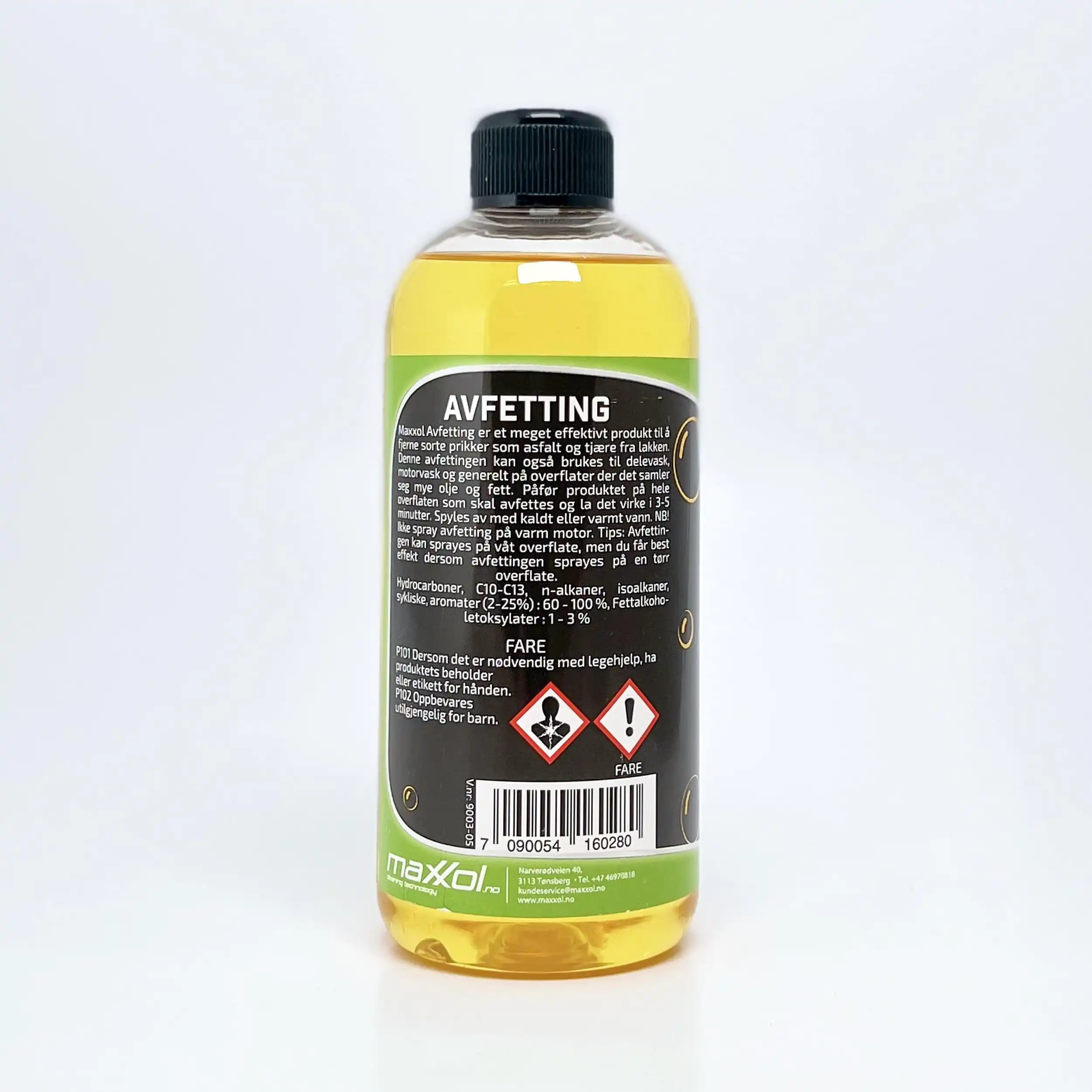 Maxxol Avfetting 500ml er et petroleumsbasert avfettingsmiddel. Om du har du sorte prikker på lakken din, kan det være asfalt. Asfalt prikker i lakken lar seg ikke fjerne så lett. Maxxol Avfetting fjerner effektivt salt, fett, olje og tjære. Avfettingen kan også brukes som et antirustmiddel. Kan også brukes på bobil, motorsykkel, lastebil osv