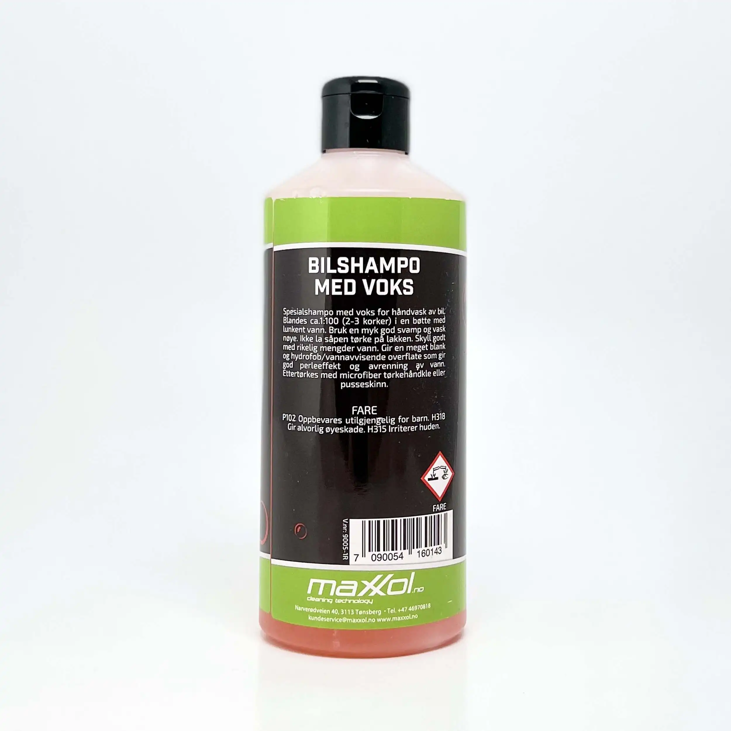 Maxxol Bilshampo med Voks er en spesial shampo for håndvask av kjøretøy, som bil, motorsykkel, bobil, lastebil osv. Blandes ca 1:100 (2-3 korker) i en bøtte med lunket rent vann. Bruk en myk og god svamp, vask nøye. Det er viktig å Ikke la såpen tørke på overflaten, da dette kan skade overflaten. Bruk rikelig med vann og skyll godt med vannslangen. Tørk av overflaten med en mikrofiber klut eller pusseskinn, slik at du får en ren og blank overflate. Gir en meget blank og hydrofob/vannavvisende overflate.