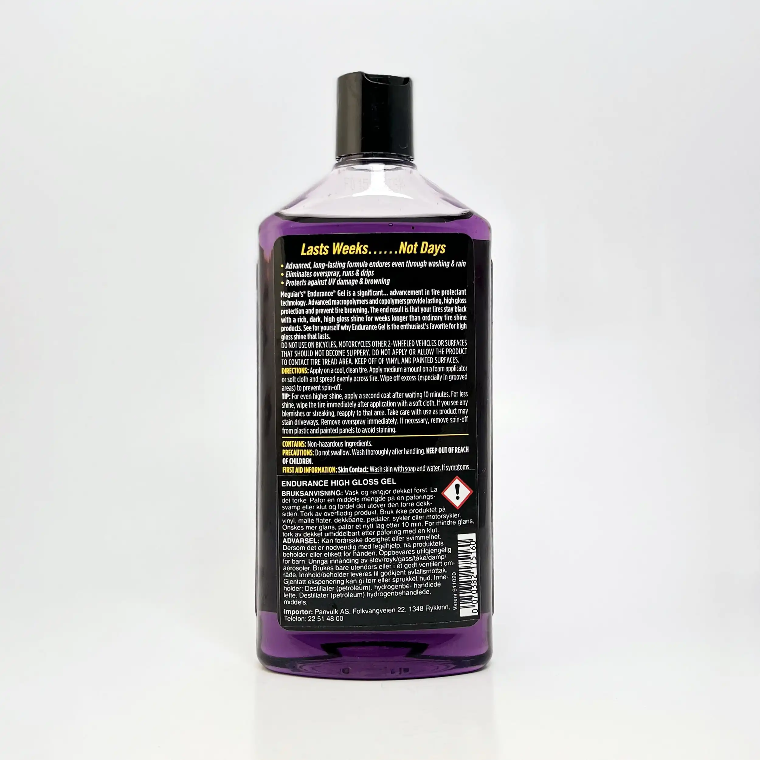 Endurance High Gloss Tyre Protection Gel fra Meguiars fortsetter å være favoritten til entusiastene. Denne har en unik formel som stopper misfarging av dekkene og gir dem en mettet og dyp svart glans. Denne gummifornyeren gir meget langvarig dekk-beskyttelse. I tillegg beskytter den dekkene dine mot UV skader og solbleking. Endurance er tyktflytende, den drypper og renner ikke. Kan enkelt påføres med svamp og er meget drøy i bruk.