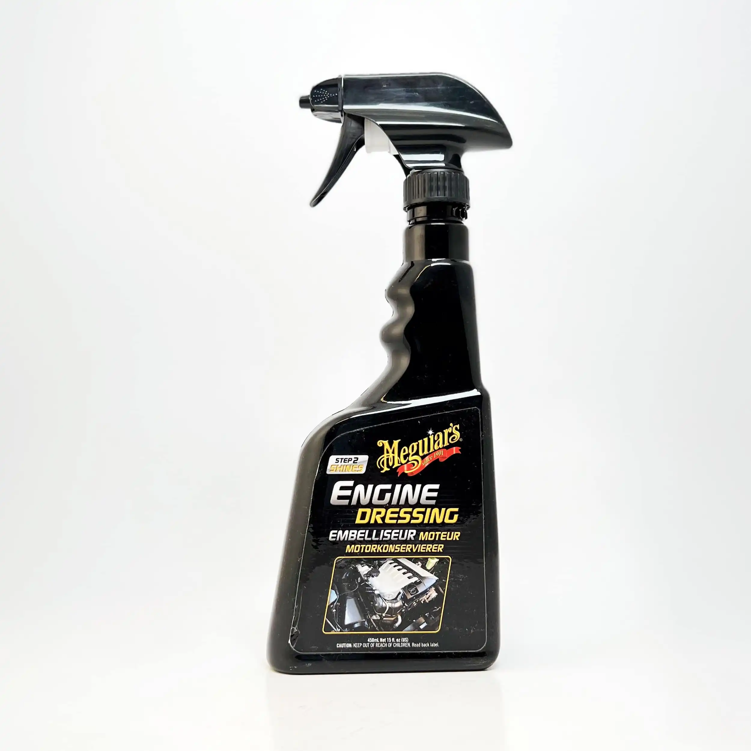 Meguiars Engine Dressing holder motoren ren. Det er den trygge og enkle løsningen for å få de ulike materialene i motorrommet til å ta seg best mulig ut. Fettfri formel gir et utseende med dyp og fin glans, som også sikrer langtidsbeskyttelse av plast, gummi og slanger. Beskytt og vedlikehold alt under panseret med Meguiar’s Engine Dressing.