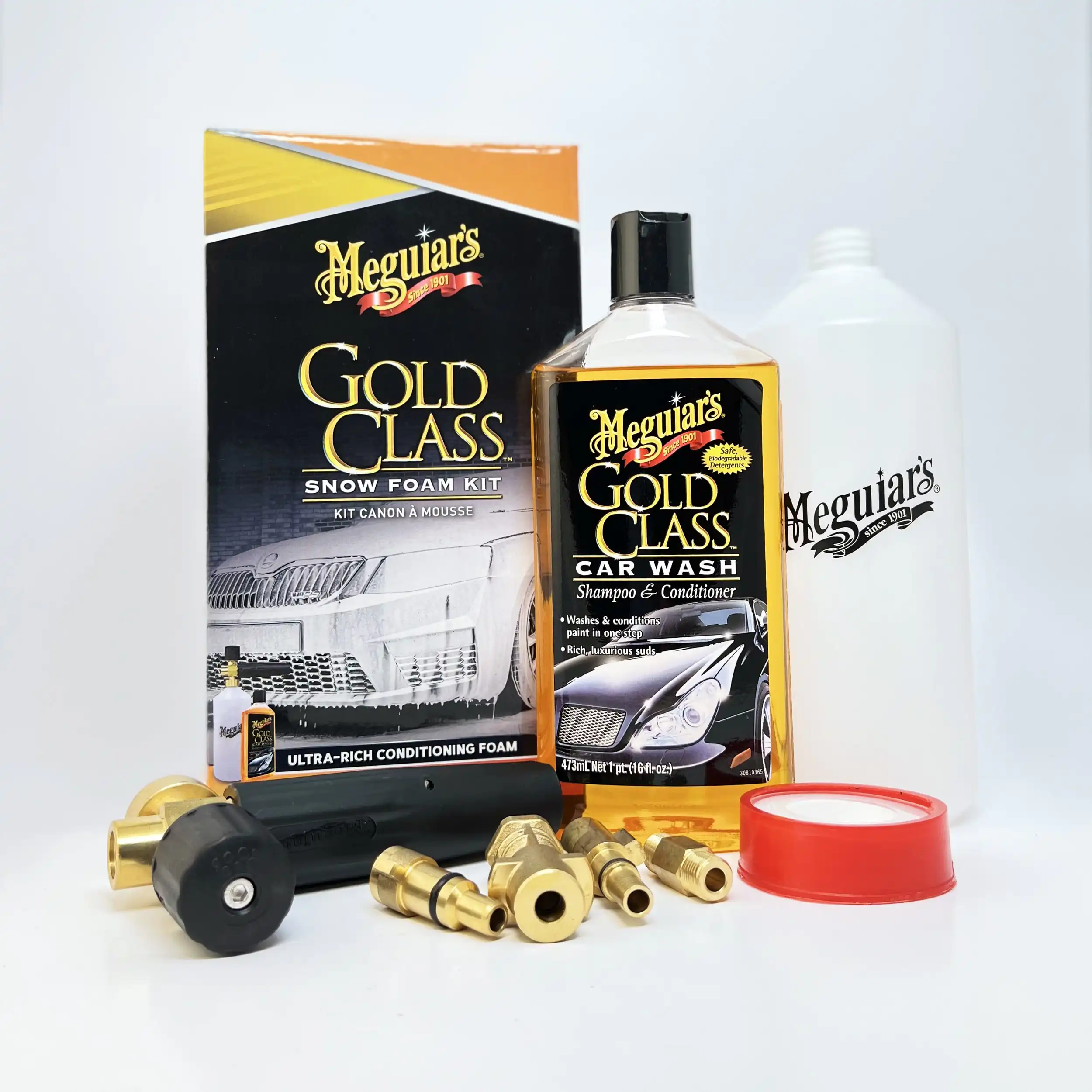 Meguiars Gold Class Snow foam kit, en luksuriøs og høyt skummende bilvask. Gir en glatt og glansfull finish uten å fjerne voksen. Produktet har i tillegg en balsam effekt som styrker lakken og gir en glatt og vannavvisende overflate som reduserer tørketiden.
