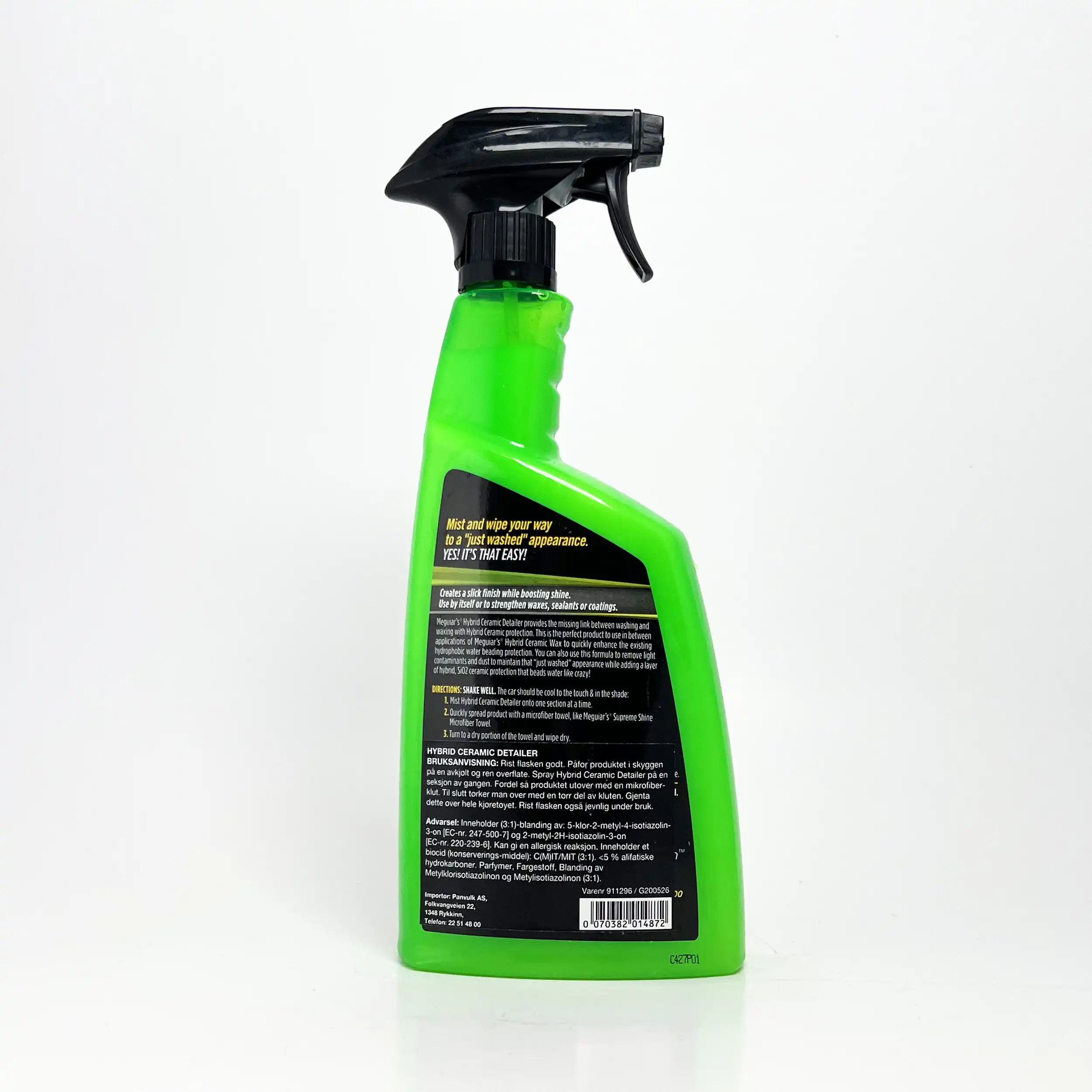 Meguiars hybrid ceramic detailer gir en ceramic beskyttelse på bilen din. Veldig enkel å bruke, spray på og tørk av. Den fjerner lette forurensninger som vannmerker etter det har regnet, lett pollen osv. Tilfører også en dybde og glans som man skulle tro kun var mulig etter man hadde lagt voks. På toppen av dette øker den vann avisning radikalt.