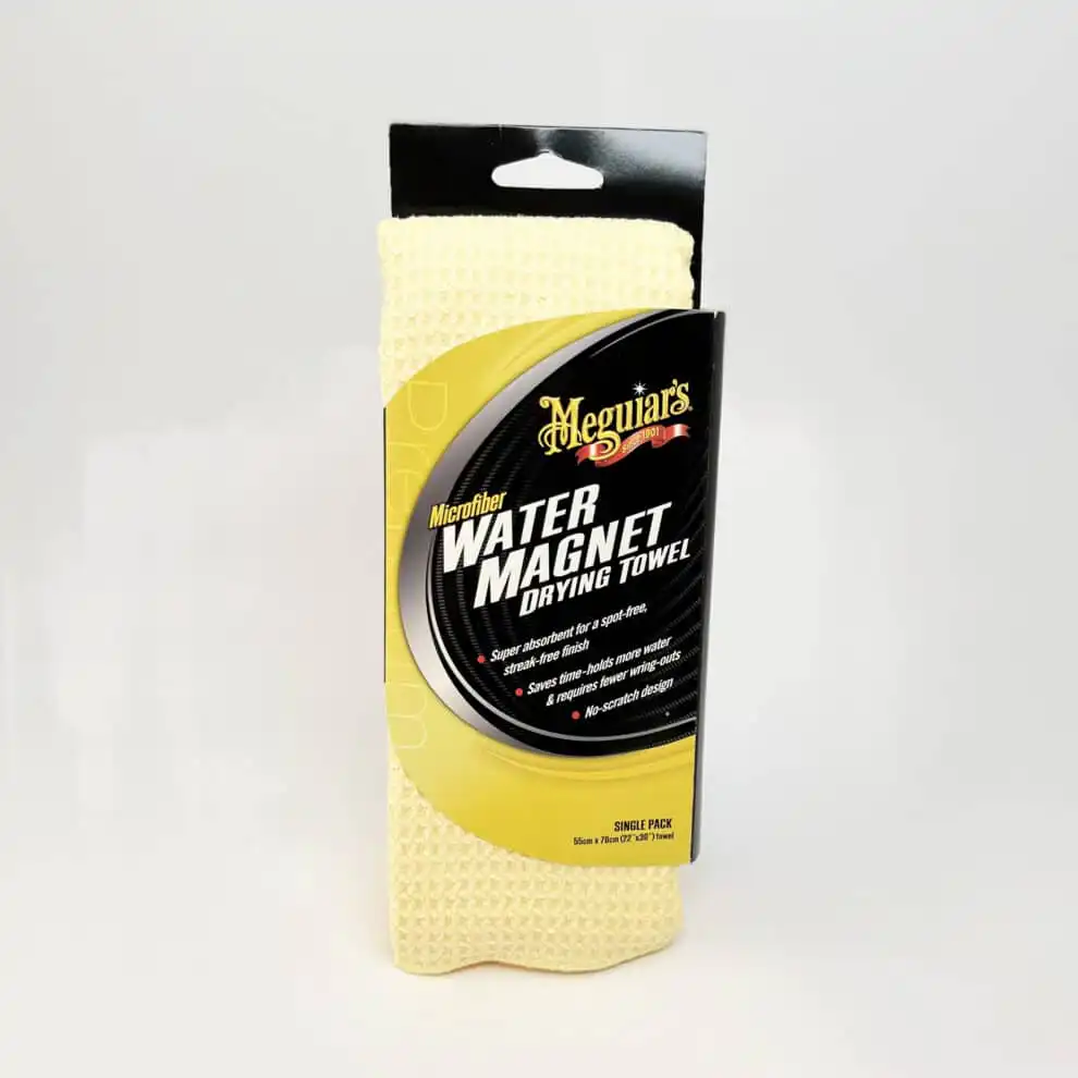 Meguiars Water Magnet Towel et ekstra stort (70x55cm) mikrofiber håndkleet absorberer 3 ganger mer vann enn vanlige kluter og hånkler. Er skånsom mot lakken og vil redusere tiden det tar å tørke bilen og etterlater ikke merker eller swirls.