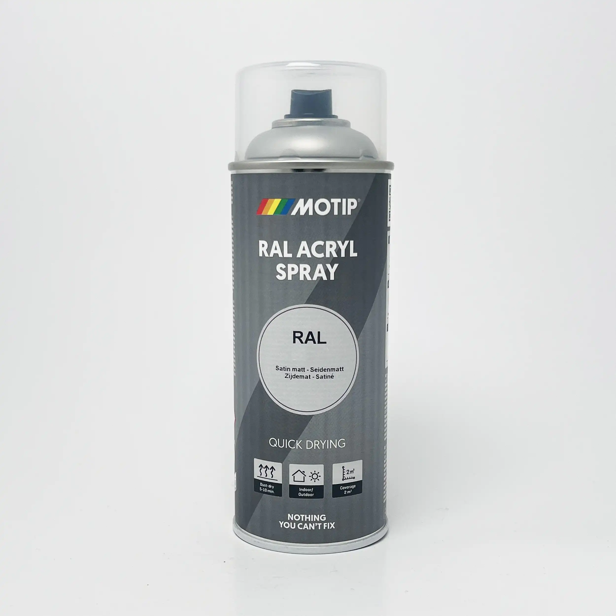 Motip RAL Farger Spray er en hurtigtørkende spraymaling med høy dekning og fyll egenskaper. Til behandling av nesten alle overlater, behandlet og ubehandlet. Til bruk på tre, metall, aluminium, glass, stein og ulike typer plast. Lakken har en varig glans og farge, er ripe fri, støtsikker og er rustforebyggende.